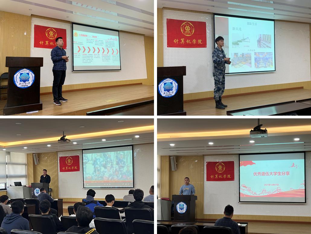 随后三名优秀退伍大学生分享各自的军营生活以及感悟。他们回顾了部队生活的点点滴滴,并分享了这些年军旅生活的感悟收获。同时也向同学们介绍个人退伍复学后的学习、科研和生活相关情况。在分享过程中,三名优秀退伍大学生纷纷表示经过部队的锻炼,自己更加深刻认识到当代青年身上肩负的使命,更加深了对保家卫国深层次的理解,身体素质和意志品质得到了极大锻炼与提升,价值观层面也得到了升华。退伍复学优秀大学生的分享,让在场的同学深有感触,大大激发了同学们参军入伍的热情与激情。