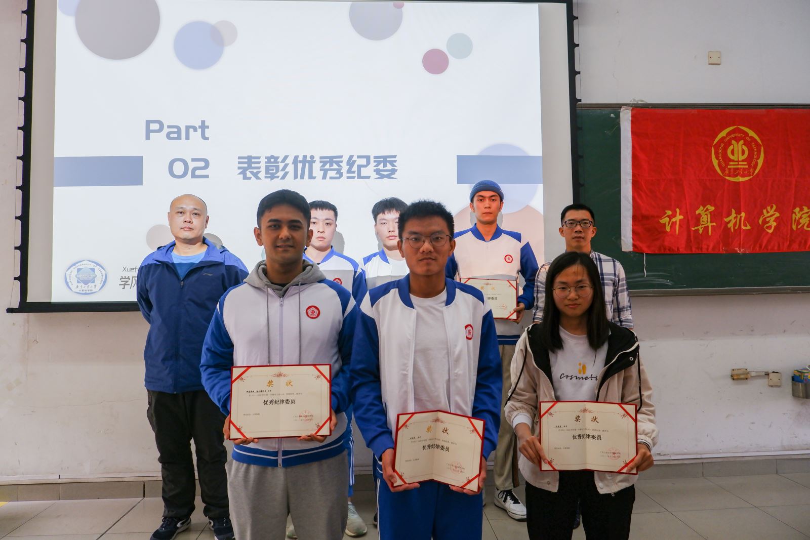 大会上,韩韬老师和刘冬宁老师对各年级优秀纪律委员进行表彰。刘冬宁老师为同学详细解读了学院的培养方案,并介绍了学院与华为、字节跳动等优质企业的联合培养项目,鼓励同学们积极向学,奋发有为。
