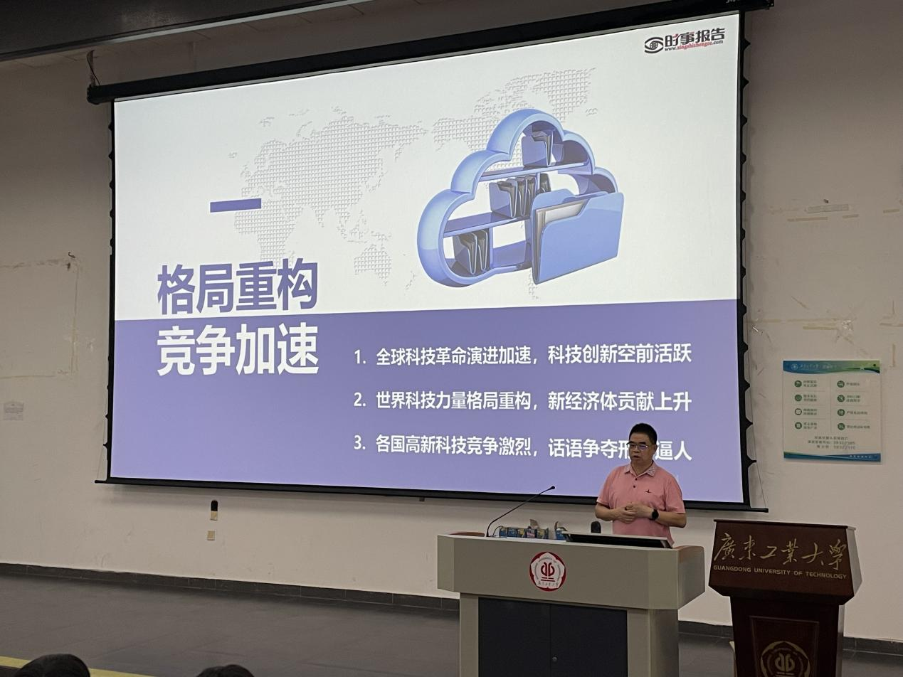 程良伦首先通过图文讲解,生动的展现了在共产党的带领下我国如何从科技落后的“万国造”到自主创新的“中国智造”的转变,为人类生产生活方式带来重大变革,然后从“格局重构,竞争加速”、“把握机遇,应对挑战”、“国之重器,自立自强”三个方面讲述了学科之间、科学和技术之间、技术之间、自然科学和人文社会科学之间日益呈现交叉融合趋势以及未来科技发展的趋势。程良伦鼓励同学们直面我国核心技术受制于人的“卡脖子”问题,一是要善于将技术与服务融合,在科研学习中始终保持恒心和韧劲,持之以恒、接力攻关;二是要坚持不懈走自主创新之路,保持自主创新的战略定力,不断在攻坚克难中追求卓越,切实为建设现代化经济体系和创新型国家提供战略支撑;三是要肩负起科技创新的历史使命,将现存的“卡脖子”环节逐个攻克,掌握更多核心关键技术,有力支撑世界科技强国建设。