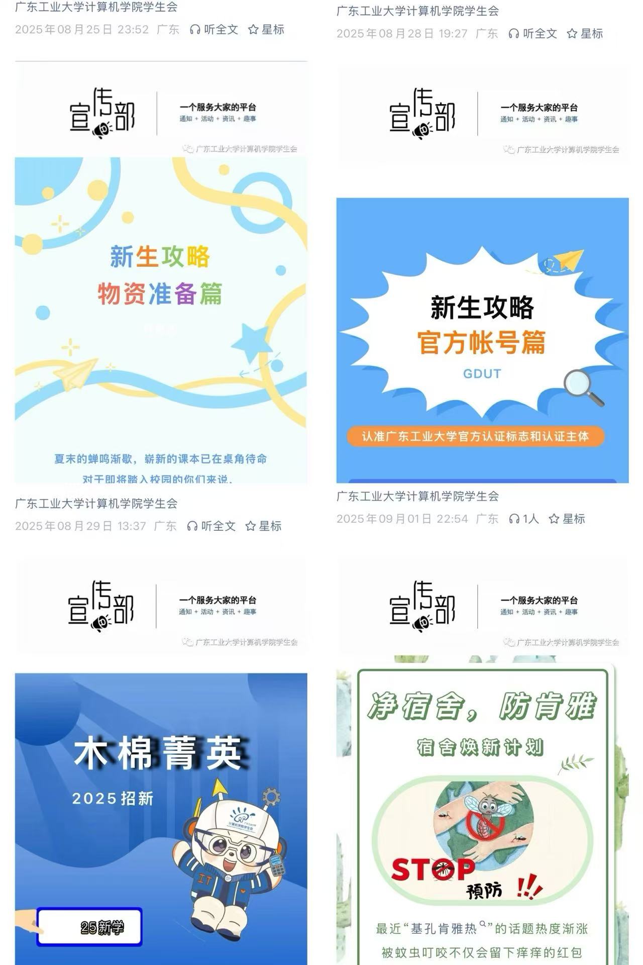 为满足新生校园生活信息需求,学生会依托微信公众号、QQ群等线上平台,9月全程推送“新生攻略”系列内容。攻略涵盖校园设施指引、教务系统操作、生活小贴士、学院资源介绍四大板块,细化教学楼、图书馆等场所使用说明及选课、快递收发等流程指南,内容详实且图文并茂。截至9月底,系列推文累计阅读量达3000余次,多次被新生转发分享,成为新生快速适应校园的实用工具,显著提升信息服务的便捷性与实效性。